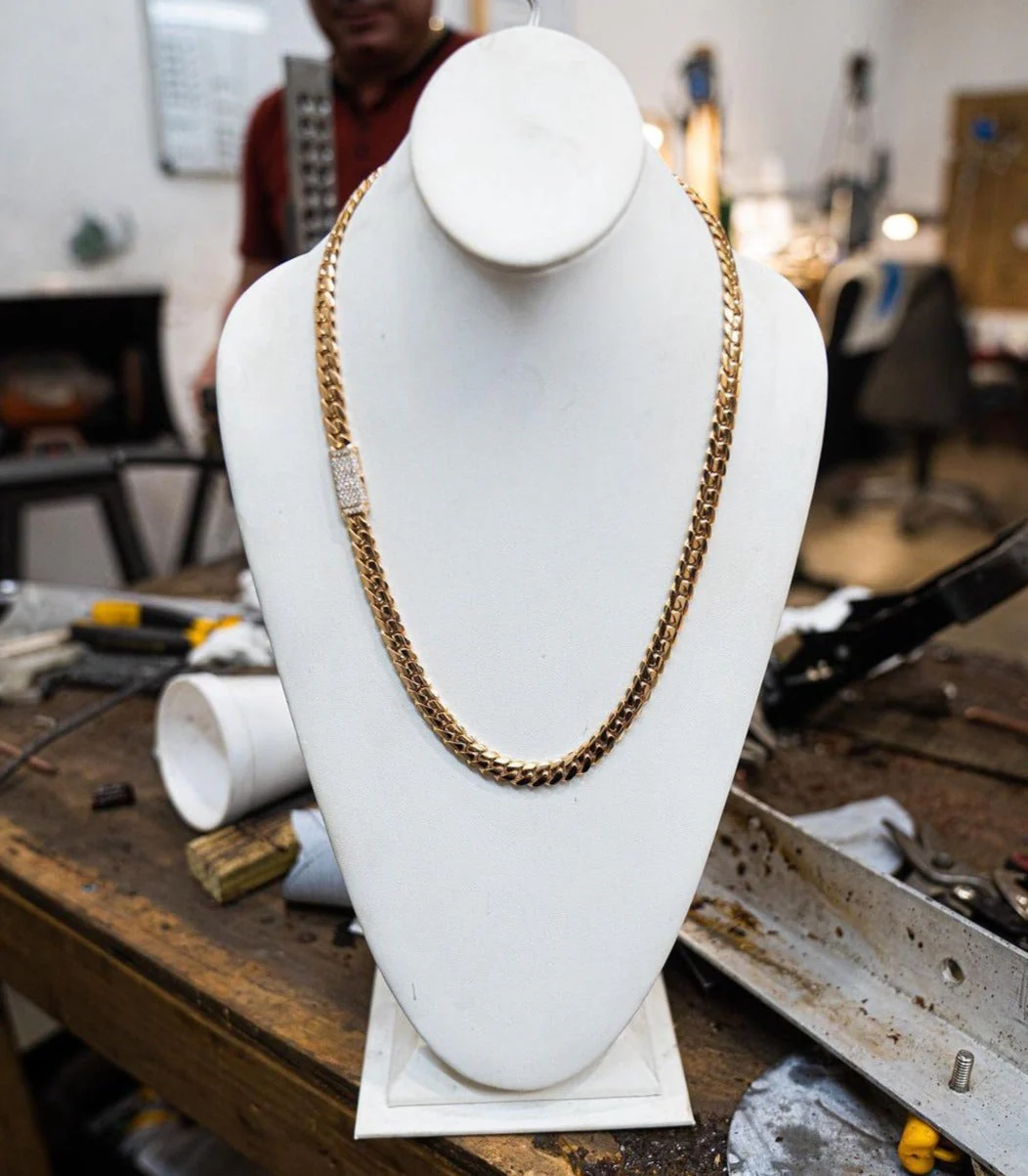 - PRODUCT DETAILS: This is an Exclusive 22kt Gold Micron Plated 925 Pure Sterling Silver Miami Cuban Link Chain with Iced Lock Studded with AAA+ Swarovski Diamonds.Ā