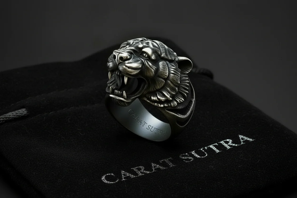 RARE PRINCE by CARAT SUTRA | Unique Designed Tiger Face Ring | 925 Sterling Silver Oxidized Ring | Men's Jewelry | With Certificate of Authenticity and 925 Hallmark