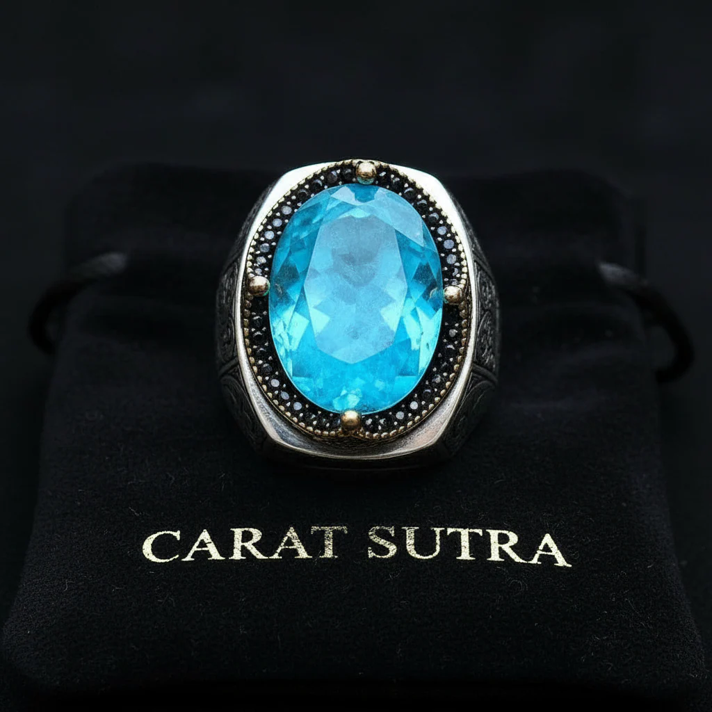 RARE PRINCE by CARAT SUTRA | Unique Designed Turkish Style Heavy Ring with Natural Blue Topaz | 925 Sterling Silver Oxidized Ring | Men's Jewelry | With Certificate of Authenticity and 925 Hallmark