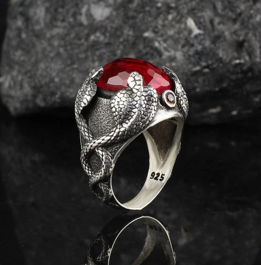 -70%RARE PRINCE by CARAT SUTRA | Unique Designed Snake Ring with Red Zircon | 925 Sterling Silver Oxidized Ring | Men's Jewelry | With Certificate of Authenticity and 925 Hallmark—
