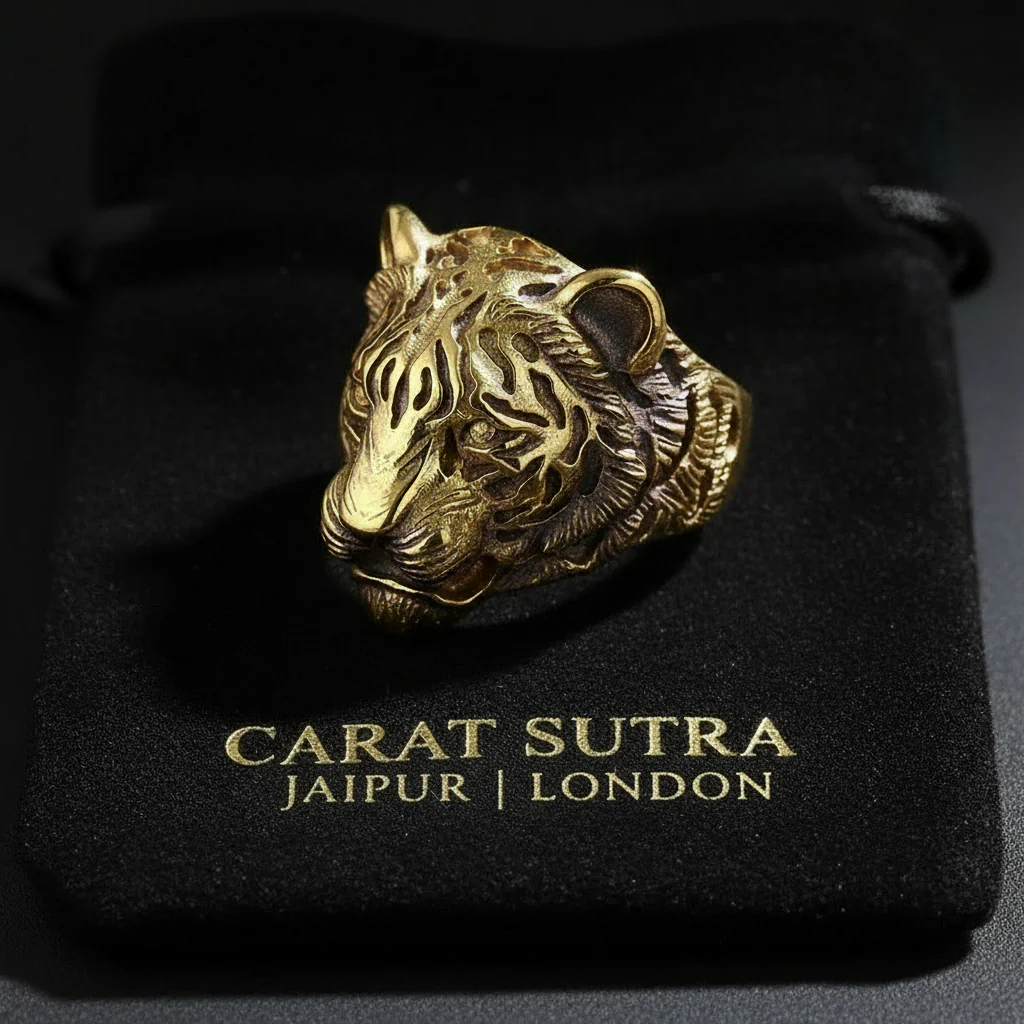 RARE PRINCE by CARAT SUTRA | Unique Designed Tiger Face Ring | 22kt Gold Micron Plated 925 Sterling Silver Oxidized Ring | Men's Jewelry | With Certificate of Authenticity and 925 Hallmark
