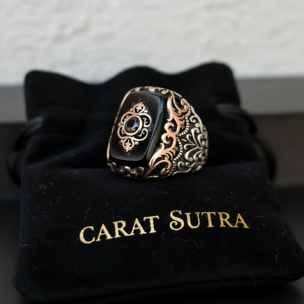 RARE PRINCE by CARAT SUTRA | Unique Turkish Style Ring with Natural Black Onyx | 925 Sterling Silver Oxidized Ring | Men's Jewelry | With Certificate of Authenticity and 925 Hallmark