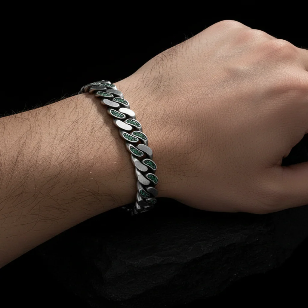 RARE PRINCE by CARAT SUTRA | 10mm Unique Green Emerald Iced Cuban Link Bracelet for Men | Dark Oxidized 925 Silver Bracelet | Men's Jewelry | With Certificate of Authenticity and 925 Hallmark