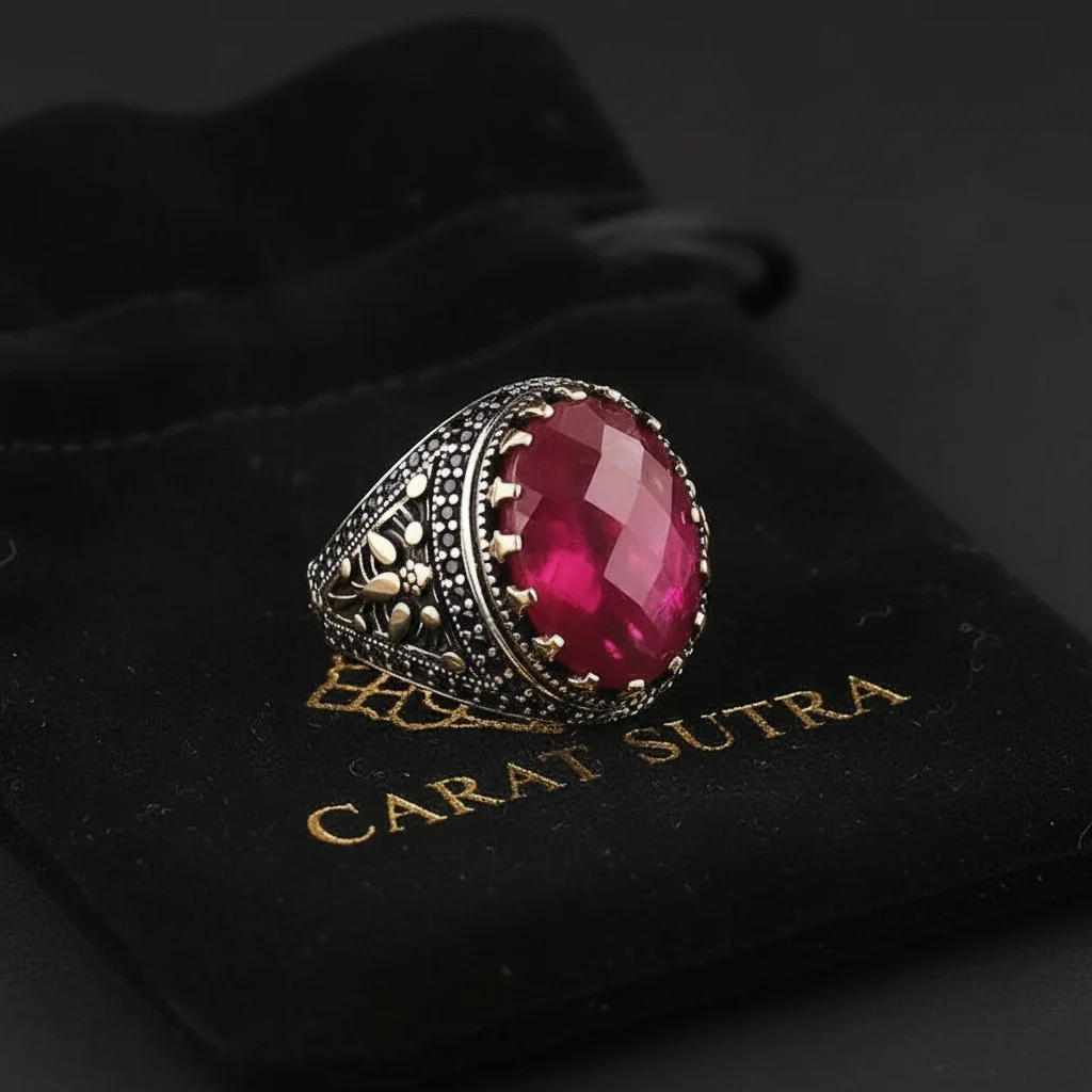 RARE PRINCE by CARAT SUTRA | Unique Designed Turkish Style Heavy Ring with Natural Red Ruby | 22kt Gold Micron Plated 925 Sterling Silver Oxidized Ring | Men's Jewelry | With Certificate of Authenticity and 925 Hallmark