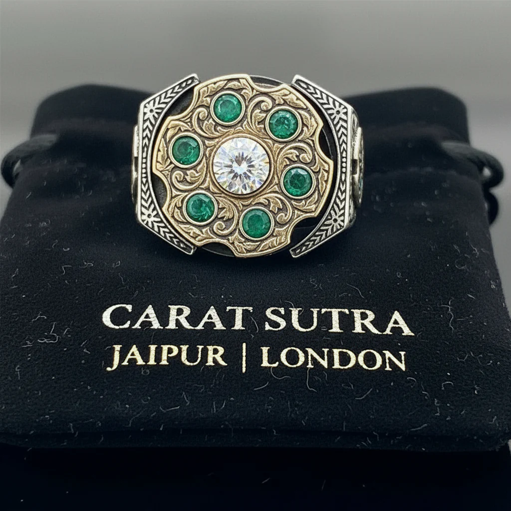 RARE PRINCE by CARAT SUTRA | Unique Designed Turkish Style Ring with 6 Stone Emerald Ring | 925 Sterling Silver Oxidized Ring | Men's Jewelry | With Certificate of Authenticity and 925 Hallmark